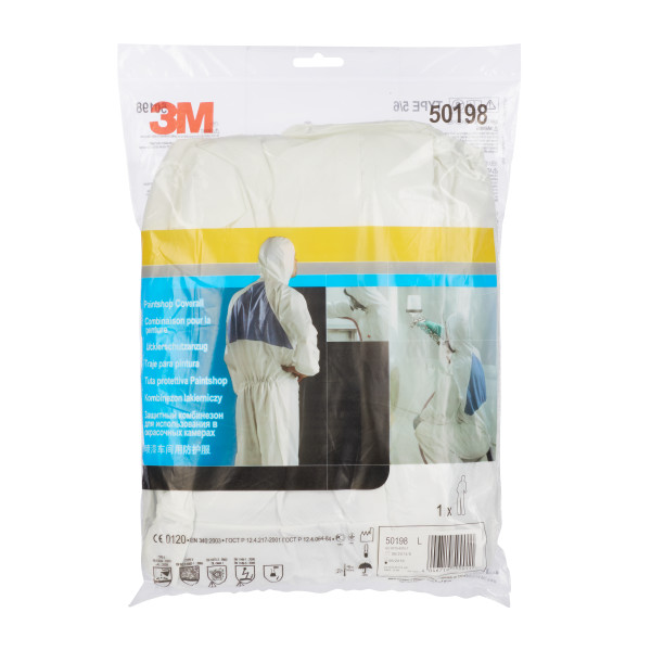 3M™ Vernedress for lakkverksted 50198 er CE-sertifisert i kategori III etter Type 5/6-standards. Den er sertifisert i henhold til EN 119 for å redusere oppbyggingen av statisk ladning. Den er laget av et robust laminat på fronten som loer svært lite, og har en pustende SMMS-trekant i ryggen for å gi den beste balansen mellom beskyttelse og komfort.
