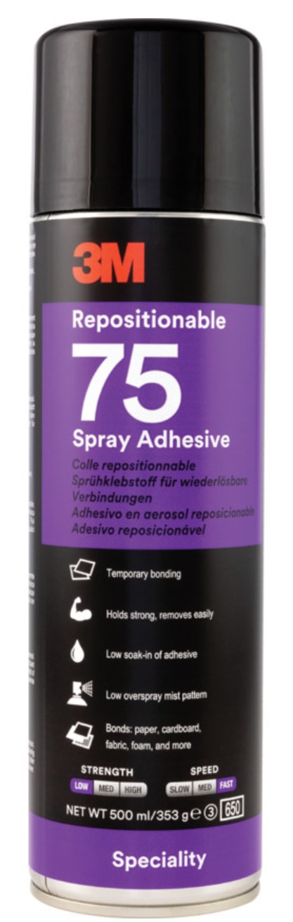 3M™ flyttbart spraylim 75 er vårt allsidige trykkfølsomme spraylim, som passer for midlertidig hold eller plassering av lettvektsmaterialer for framvisning eller før endelig montering. Kleber i løpet av sekunder, men har likevel en ekstra lang kleberekkevidde som tillater løfting og reposisjonering av materialer.