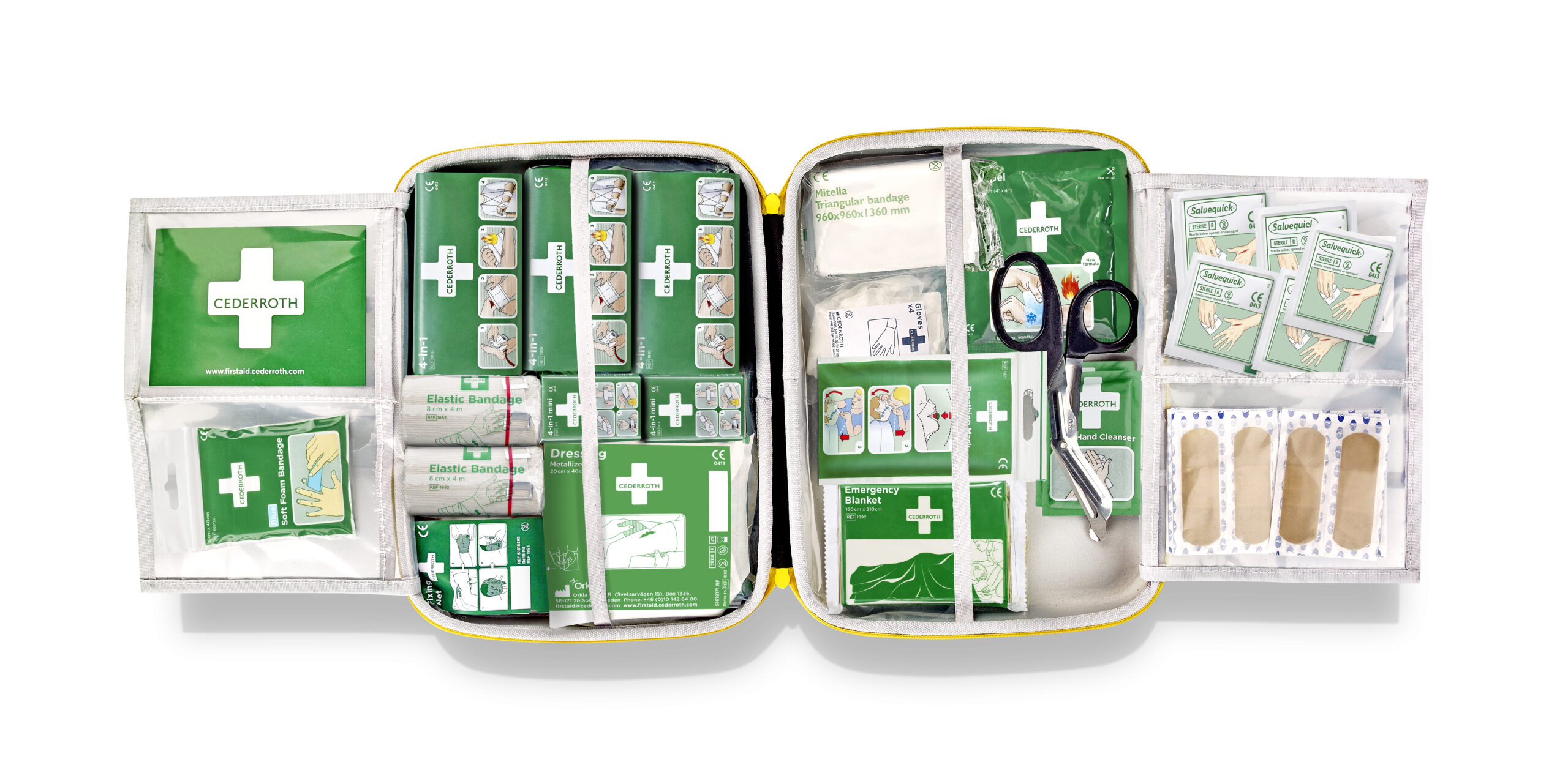 Cederroth First Aid Kit Large er en velutstyrt Førstehjelpsveske, laget i et gummilignende materiale med matt overflate for å holde støv, fukt og smuss ute.