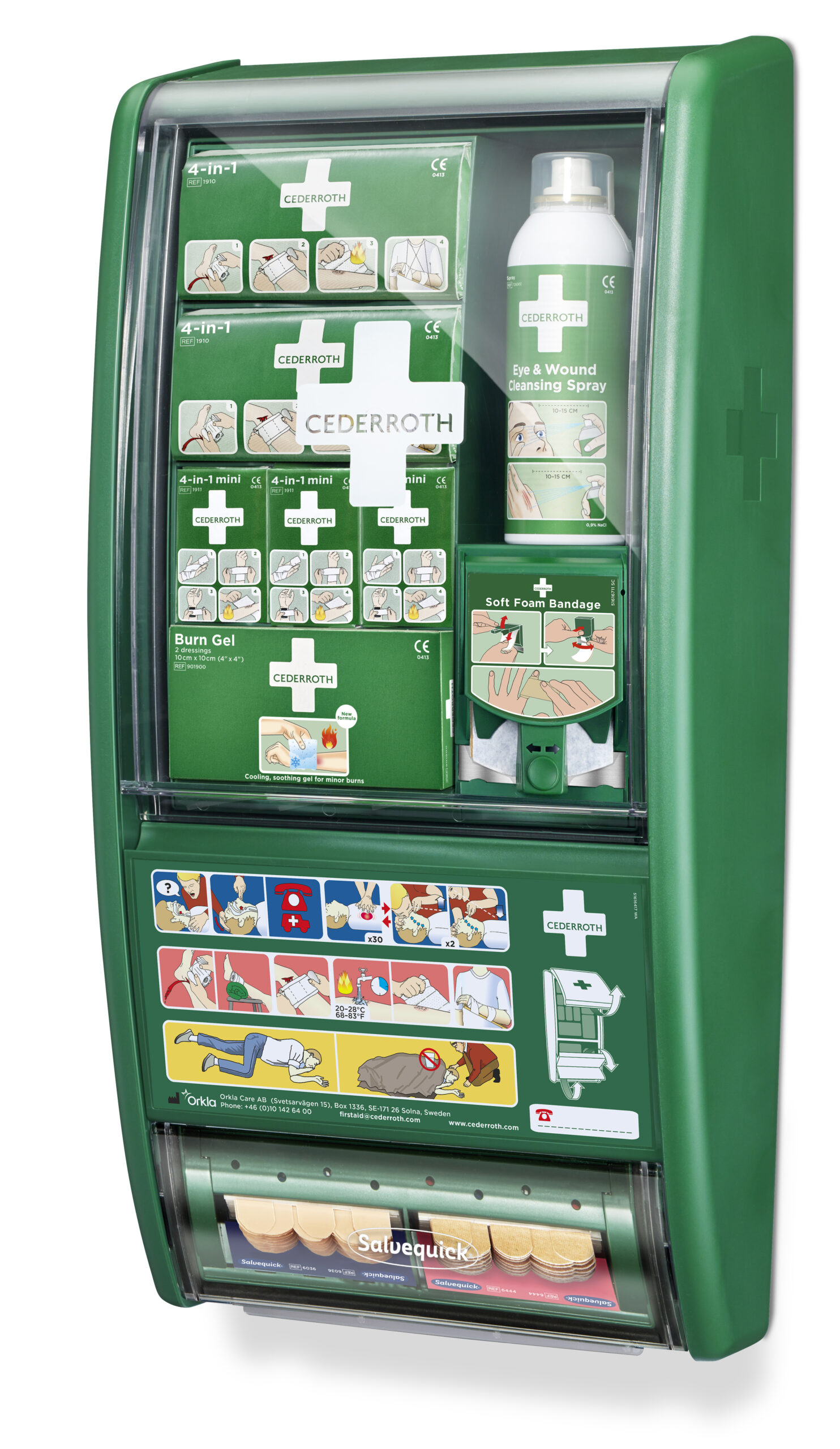Cederroth førstehjelpsstasjon og kan håndtere flere typer skader, og kan også tilpasses til forskjellige førstehjelpsbehov.