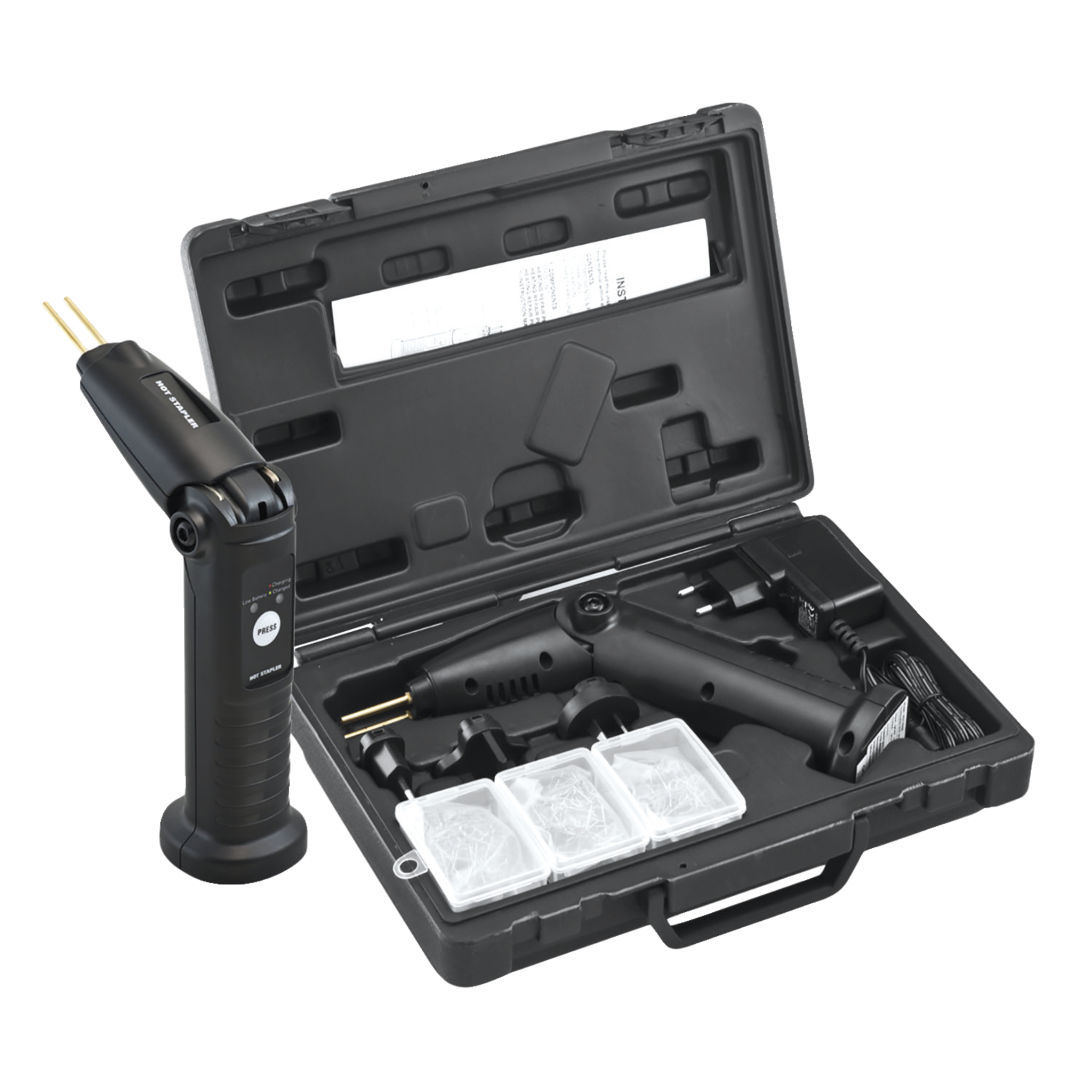 Enkel å bruke, den trådløse plastsveiseren gir rask og presist arbeid. Ved oppvarming av ulike typer stifter i rustfritt stål, er det mulig å sammenføye og reparere alle plastdeler av kjøretøy.