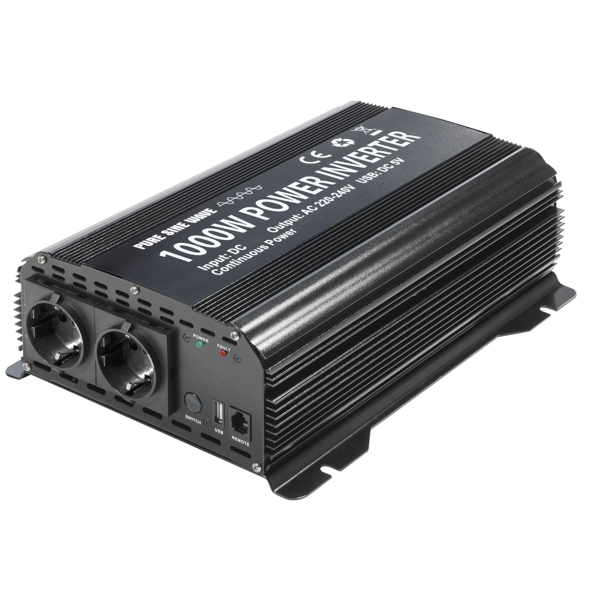 Inverter – Pure Sine Wave. Dobbelt uttak + USB. PSW omformeren konverterer strøm fra bilbatteriet til en 230V strømforsyning for alle elektriske apparater opp til 1000W. USB-kontakten (5V) lar deg koble til elektriske apparater som MP3-spillere, digitale kamera m.m.