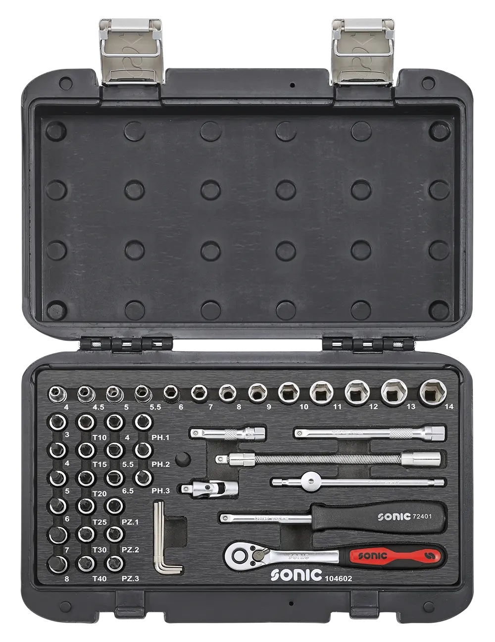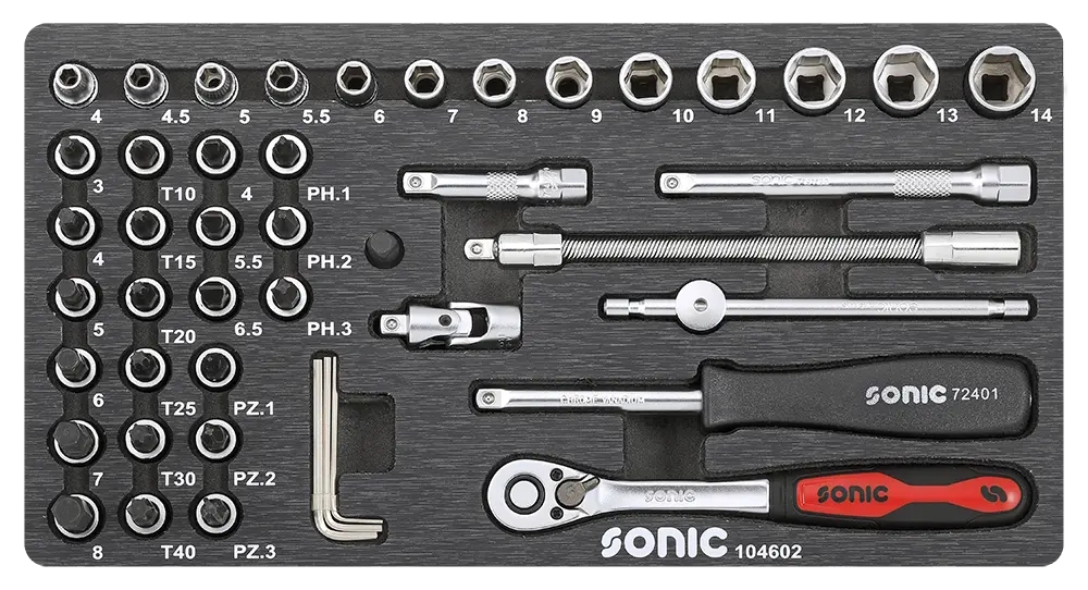 Sonic 1/4″ pipe- og bitssett er et kompakt og allsidig verktøysett med 46 deler, perfekt for presisjonsarbeid i verksted, service og montering.