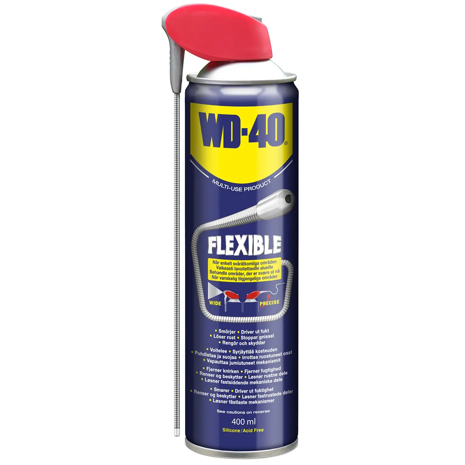 Med brukeren i fokus er denne WD-40® Multisprayen utstyrt med et fleksibelt påføringsrør med en lengde på 18 cm, som kan bøyes og rettes til ønsket form.